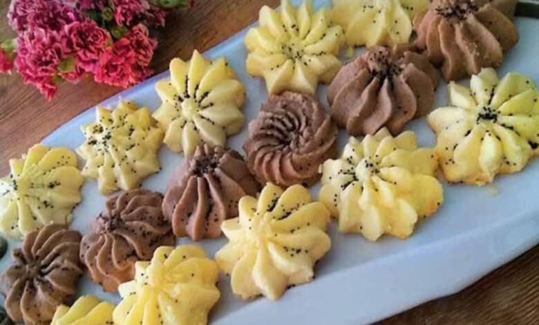 حالا مواد را داخل قیف ریخته و روی ظرف فری که داخل آن کاغذ روغنی قرار داده ایم، با فاصله قرار می دهیم و روی آنها را تزئین می کنیم. سپس داخل فر ۱۸۰ درجه به مدت ۱۵ تا ۲۰ دقیقه می پزیم. شما می توانید کف تابه کاغذ روغنی گذاشته و شیرینی ها را روی شعله بپزید.
