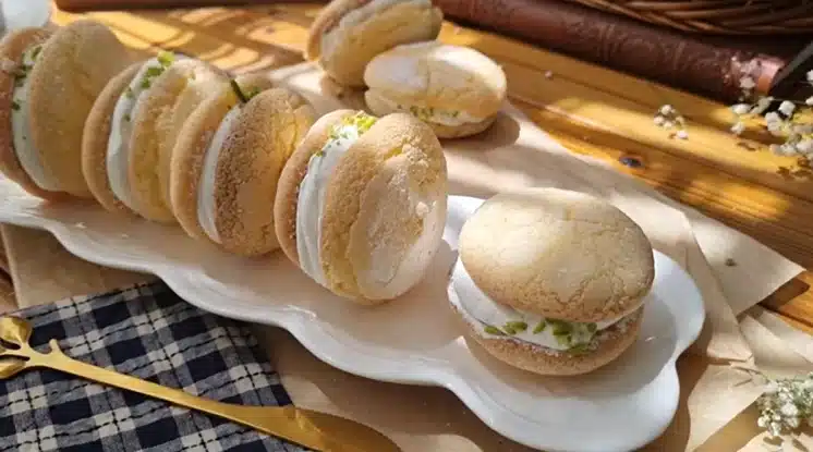 مواد را طوری با لیسک مخلوط کنید که پف سفیده نخوابد. سپس کم کم مخلوط آرد را اضافه می کنیم و دورانی ترکیب می کنیم. مایع را داخل قیف ریخته و داخل سینی فری که با کاغذ روغنی پوشیده شده است به صورت دایره ای قرار می دهیم. سپس مقداری پودر قند روی شیرینی ها الک کرده و آنها به مدت ۱۰ دقیقه داخل فر ۱۸۰ درجه قرار می دهیم تا بپزد. بعد از خروج از فر و کمی خنک شدن با قیف بین شیرینی ها به مقدار دلخواه خامه قرار داده و روی هم قرار می دهیم و کمی فشار می دهیم. سپس آنها را با پودر پسته و شکلات ذوب شده تزئین کرده و در یخچال می گذاریم.