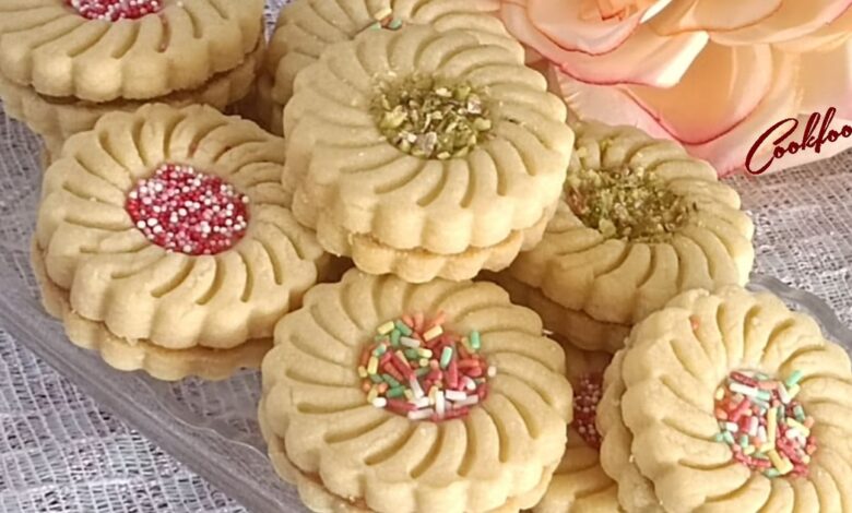حالا سینی فر را با کاغذ فر پوشانده و شیرینی ها را با فاصله قرار می دهیم و داخل فر ۱۸۰ درجه به مدت ۱۰ تا ۱۲ دقیقه می پزیم. پس از خنک شدن روی شیرینی ها مربا یا مارمالاد زده و آنها را بهم می چسبانیم. شما می توانید برای تزئین شیرینی ها از پودر پسته، نارگیل، کاکائو و شکلات آب شده استفاده کنید.