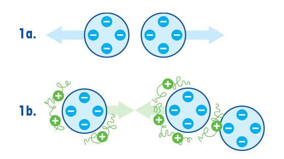 ذرات کوچک معمولاً دارای بارهای سطحی منفی هستند که مانع تجمع و ته نشینی می شوند. مواد شیمیایی فلوکولانت می توانند جذب ذرات شده و بارها را متعادل کنند. شناسایی بارهای مخالف باعث می شود ذرات به هم چسبیده و باعث ایجاد لخته های زیر میکرون پایدار و معلق شوند.  برای پراکندگی مناسب مواد شیمیایی منعقد کننده ، برای تقویت برخورد ذرات و تشکیل لخته ها مورد نیاز هستند.